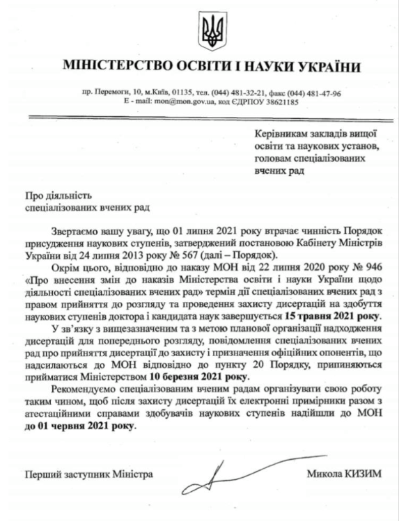 Науковцям, які хочуть отримати науковий ступінь кандидата чи доктора наук, доведеться поквапитися  МОН попередило університети та наукові установи, що після 10 березня не прийматиме оголошення про те, що дисертацію прийнято до захисту.  Про це йдеться у листі, підписаному заступником міністра освіти і науки Миколою Кизимом
