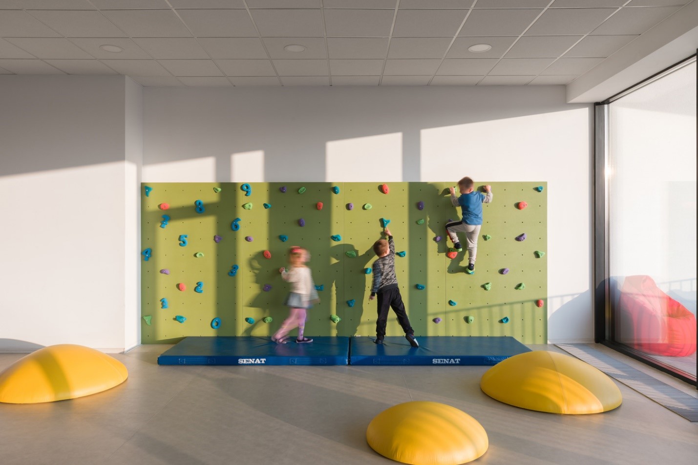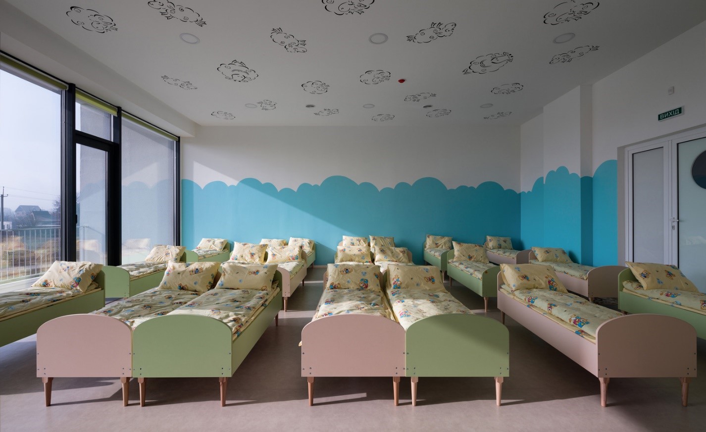 Також в садку коридори із зображенням героїв мультфільмів пристосовані для того, щоб діти їх розмальовували. У спальнях стелі також розмальовані, щоб, дивлячись на ці малюнки, діти засинали.