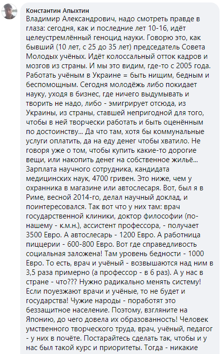 «Володимире Олександровичу, треба дивитися правді в очі: сьогодні, як і останні років 10-16, йде цілеспрямована геноцид науки. Кажу це, як колишній (10 років, з 25 до 35 років) голова Ради молодих науковців. Йде колосальний відтік кадрів і мізків з країни. І ми це бачимо, десь з 2005 року. Працювати вченим в Україні = бути жебраком, бідним і безпорадним. (...) Зарплата наукового співробітника, кандидата медичних наук, 4700 гривень. Це нижче, ніж у охоронця в магазині або автослюсаря. Ось, був я в Римі, навесні 2014-го, робив наукову доповідь, і поцікавився. Так ось що у них там: лікар державної клініки, доктор філософії (по-нашому - к.м.н.), асистент професора, - отримує 3500 євро. А автослюсар – 1200 євро. А працівниця піцерії – 600-800 євро. Там лікар і вчений – підносяться у 3,5 рази приблизно (а професор – у 6 разів). Якщо повиїжджають лікарі і науковці, то не буде і держави! Погляньте на Японію – людина розумового творчої праці, лікар, вчений, педагог – у них в пошані. Постарайтеся зробити так, щоб і у нас був такий курс і пріоритети», - кандидат медичних наук, доцент кафедри фундаментальної медицини ННЦ «Інститут біології та медицини» Костянтин Апихтін.