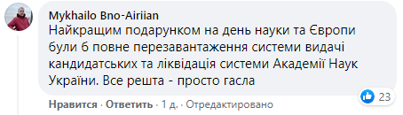 Крім того, до науковців долучився і колишній очільник Київської ОДА Михайло Бно-Айріян, який закликав змінити підхід до присудження наукових ступенів: «Найкращим подарунком на День науки та Європи були б повне перезавантаження системи видачі кандидатських. (…) Все решта – просто гасла».