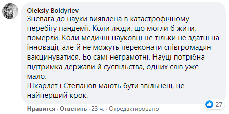 «Зневага до науки виявлена в катастрофічному перебігу пандемії. Коли люди, що могли б жити, померли. Коли медичні науковці не тільки не здатні на інновації, але й не можуть переконати співгромадян вакцинуватися. Бо самі неграмотні. Науці потрібна підтримка держави й суспільства, одних слів уже мало. Шкарлет і Степанов мають бути звільнені, це найперший крок», - науковий співробітник НАН України, координатор Днів науки, Олексій Болдирєв.