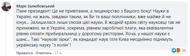 «Пане президент! Це не привітання, а лицемірство з вашого боку! Науки в Україні, на жаль, завдяки таким, як ви та ваші поплічники, вже майже й не існує... Залишилася лише ілюзія цієї науки. В жодній країні світу науковці так не принижені, як в Україні, зокрема, рівнем заробітної плати, яка еквівалентна рівню оплати прибиральниці у дорогому ресторані. Хоча, у нашої науки є шанс... Такі «наукові зірки», як кандидат наук Ілля Кива неодмінно піднімуть українську науку «з колін!»», - старший науковий співробітник Київського національного університету технологій та дизайну Марко Залюбовський.