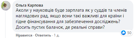 «А коли у науковців буде зарплата як у суддів та членів наглядових рад, якщо вони такі важливі для країни і гідне фінансування для забезпечення досліджень? Досить пустих балачок, де реальні справи?», - виконавча директорка Бізнес-школи КРОК, колишня віцепрезидентка «Міжнародного інститут бізнесу» Ольга Карпова.