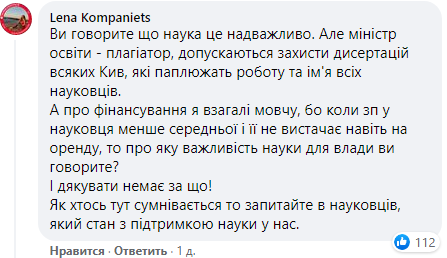 «Ви говорите, що наука – це надважливо. Але міністр освіти – плагіатор, допускаються захисти дисертацій всяких Кив, які паплюжать роботу та ім'я всіх науковців. А про фінансування я взагалі мовчу, бо коли зп у науковця менше середньої і її не вистачає навіть на оренду, то про яку важливість науки для влади ви говорите? І дякувати немає за що! Як хтось тут сумнівається, то запитайте в науковців, який стан з підтримкою науки у нас», - молодша наукова співробітниця Головної астрономічної обсерваторії НАН України, авторка ZN.UA Олена Компанієць.