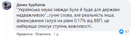 ««Українська наука завжди була й буде для держави надважливою»...гучні слова, але реальність інша, фінансування галузі на рівні 0.17% від ВВП, це найкраще описує ступінь важливості..», - завідувач науково-дослідного відділу Сумського державного університету Денис Курбатов.
