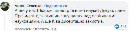 «А ще у нас Шкарлет міністр освіти і науки! Дякую, пане президенте, за цинічне знущання над освітянами і науковцями. А ще Ківа дисертацію захистив», - старший науковий співробітник Інституту фізики НАН України, популяризатор науки Антон Сененко.
