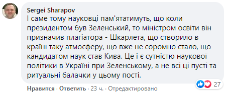 «І саме тому науковці пам'ятатимуть, що коли президентом був Зеленський, то міністром освіти він призначив плагіатора – Шкарлета, що створило в країні таку атмосферу, що вже не соромно стало, що кандидатом наук став Кива. Це і є сутністю наукової політики в Україні при Зеленському, а не всі ці пусті та ритуальні балачки у цьому пості», - завідувач лабораторії в Інституті теоретичної фізики ім М.М. Боголюбова НАН України, автор ZN.UA Сергій Шарапов.