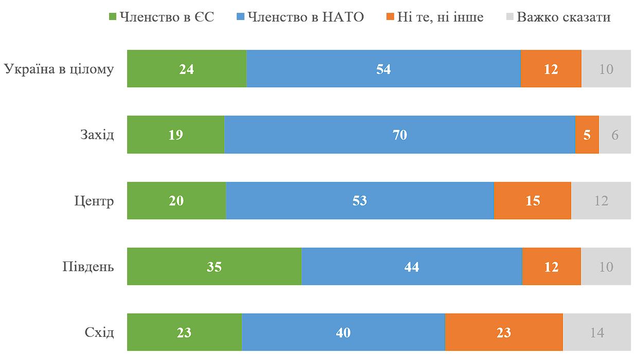 Інші респонденти відповіли «ні те, ні інше» або не змогли взагалі відповісти. При цьому у всіх регіонах більше тих, хто віддає перевагу НАТО перед Євросоюзом.