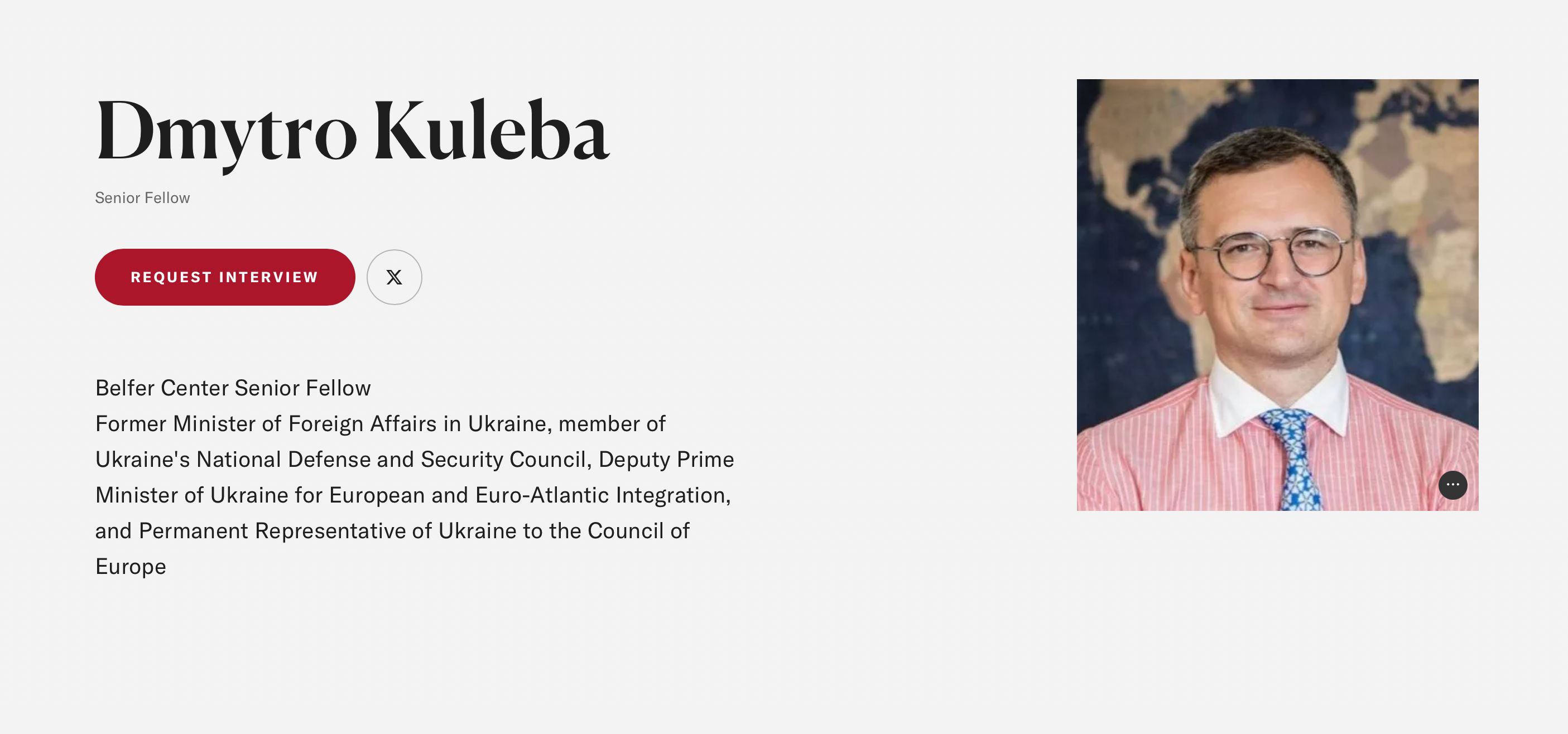 Колишній міністр закордонних справ України Дмитро Кулеба, якого відправили у відставку 5 вересня, став старшим науковим співробітником у Гарвардському університеті. Мова йде про один з провідних аналітичних центрів США — Belfer Center. На його сайті вже є сторінка Кулеби, де вказана його посада.