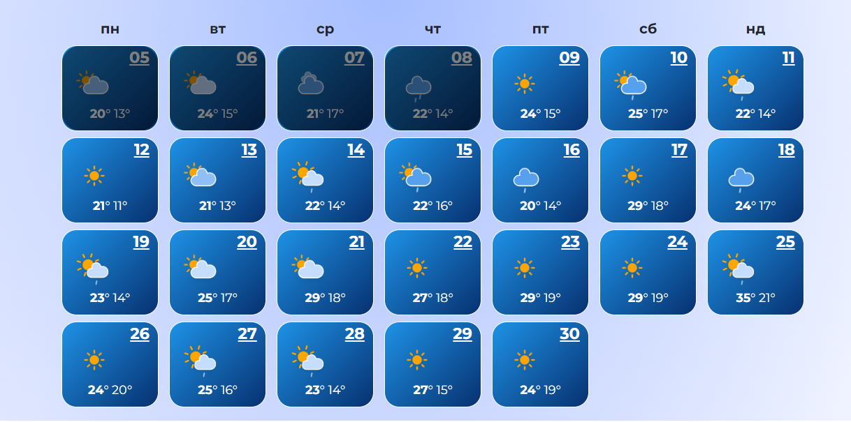 Так, у середу, 21 червня, вдень стовпчики термометрів піднімуться вгору і покажуть +29. У четвер, 22 червня в столиці очікується +27, а 23 та 24 червня - також до +29. У неділю, 25 червня, температура вдень сягне +35 градусів. Цього ж дня прогнозують невеликий дощ.