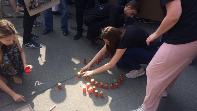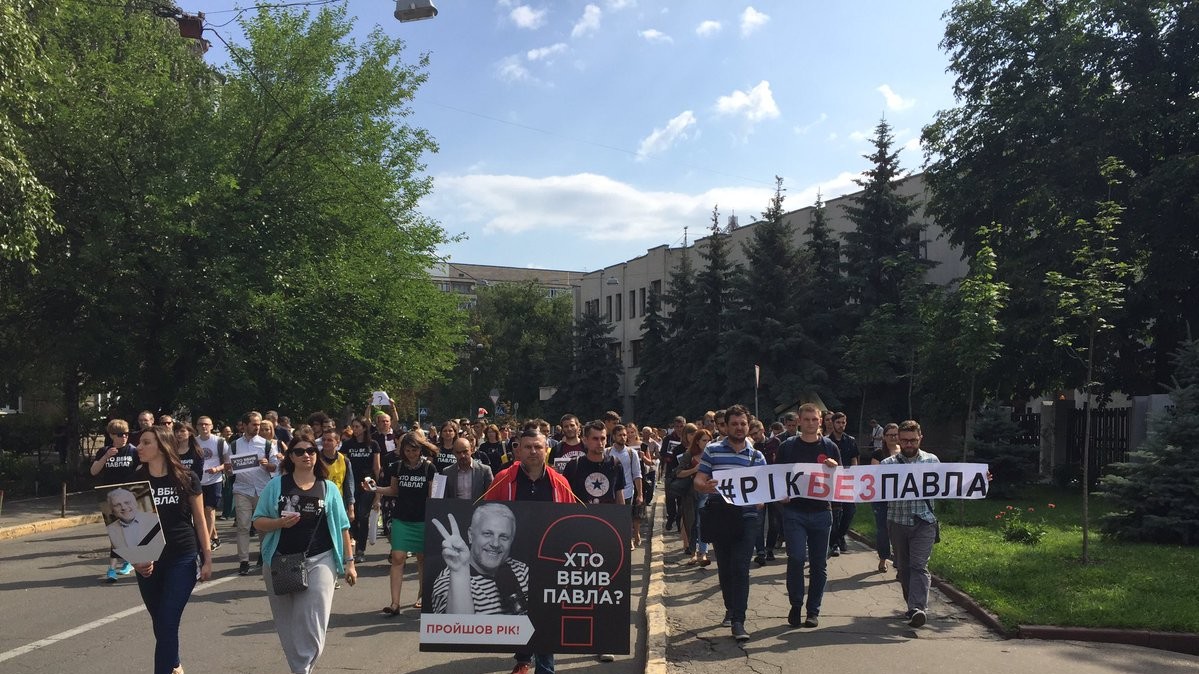 Колона людей, що сформувалася на перехресті вулиць Франка та Хмельницького, де рік тому підірвали в автомобілі Павла Шеремета, пройшла центром Києва до Адміністрації президента та головної будівлі Міністерства внутрішніх справ України. Серед учасників акції – багато українських та іноземних журналістів, повідомляє "Українська правда".