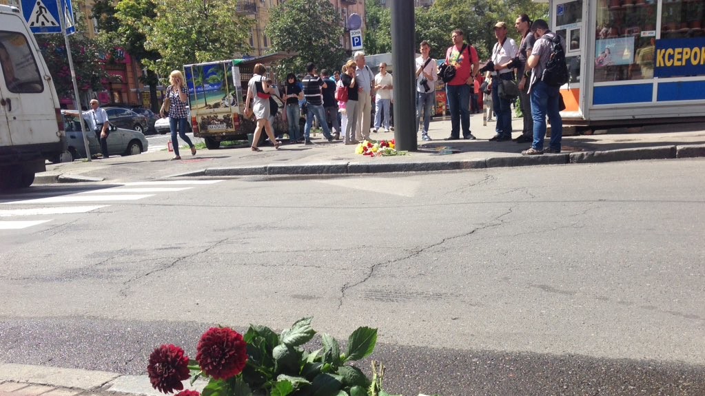 До місця, де загинув Павло Шеремет, люди приносять квіти у пам'ять про загиблого журналіста.