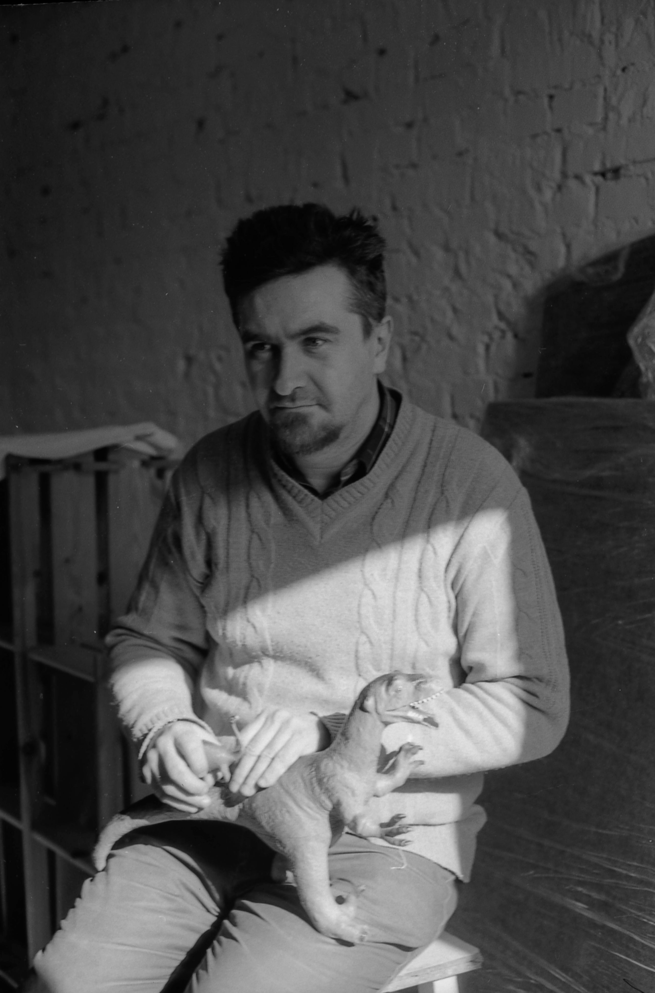 Коли я лежав, там був один чоловік, який залазив на стілець і лизав телевізор. Я його потім намалював так, ніби він хоче втекти від того жаху у світ телебачення. Хтось мріє потрапити хоча б в інтернат. А дехто лежить у лікарні все життя, до самої смерті. Такі вже навіть на вулицю не хочуть виходити, їм уже нічого не цікаво, вони просто сидять або лежать і все, кажуть, що звикли.