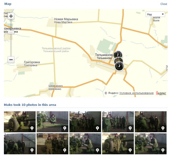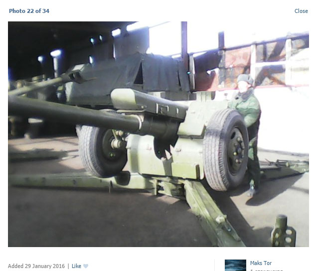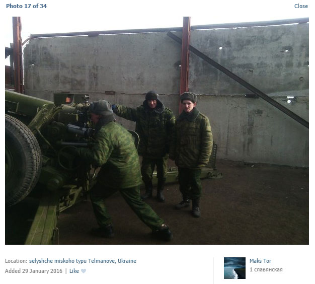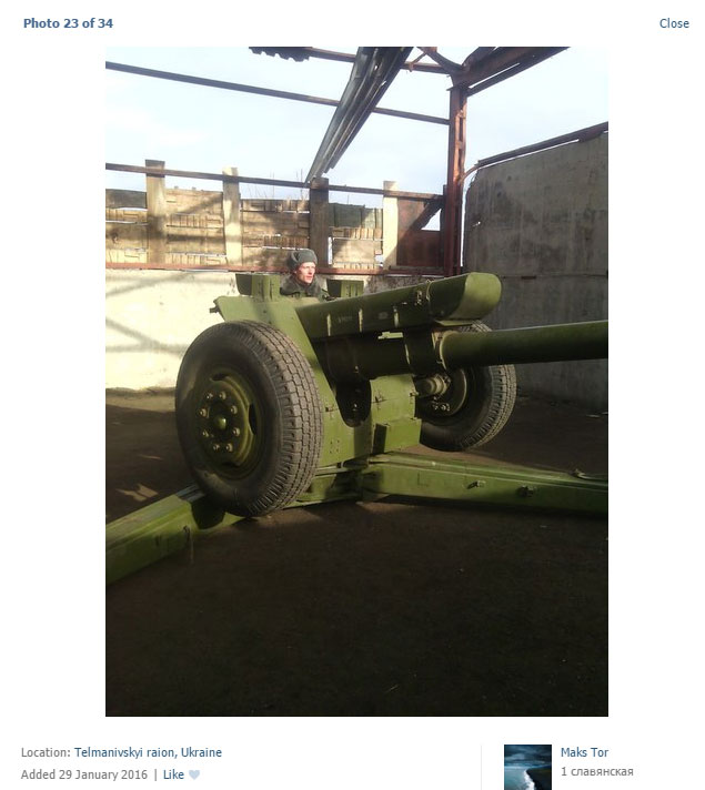 Так у соціальних мережах бойовик з вигаданим ім'ям Maks Tor в соціальній мережі розмістив фото 122-мм гаубиць Д-30А, крім того, він поставив геолокаціі, яка свідчить, що зброя знаходиться в Тельмановьском районі - в 12 км від лінії розмежування.