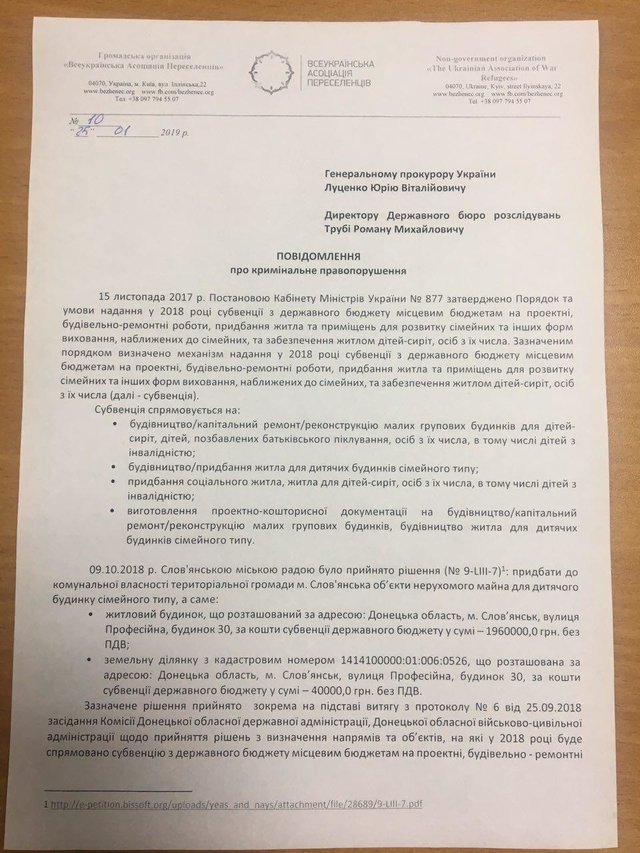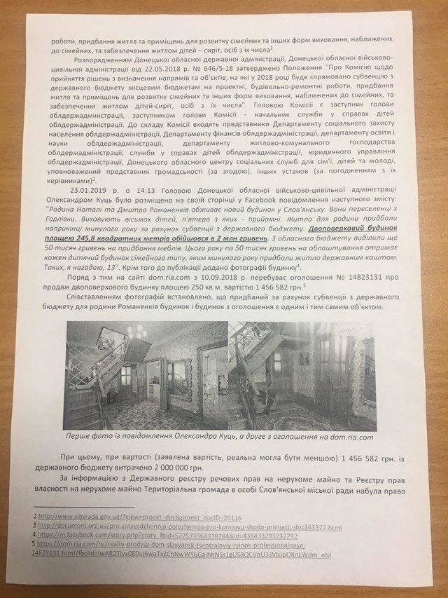 9 жовтня Слов'янський міськрада вирішила купити в комунальну власність будинок із земельною ділянкою для подальшої передачі їх дитячому будинку сімейного типу. Будинок повинні були передати родині переселенців з Горлівки з прийомними дітьми. Як похвалився 23 січня голова Донецької ОВГА Олександр Куць для сім'ї придбали двоповерховий будинок площею 245,8 квадратних метрів за 2 млн гривень.