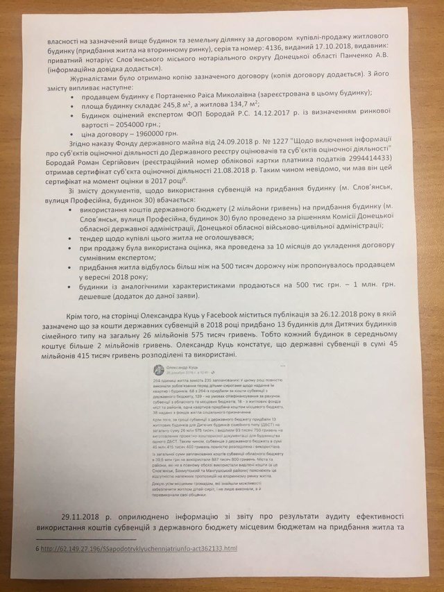 Він також зазначив, що це не єдиний випадок, оскільки в 2018 році за кошти державних субвенцій для дитячих будинків сімейного типу в загальній складності було придбано 13 будинків на загальну суму 26,5 млн гривень. Тобто кожен будинок в середньому коштує більше 2 мільйонів гривень, що на 0,5 - 1 млн грн дорожче ринкової ціни.