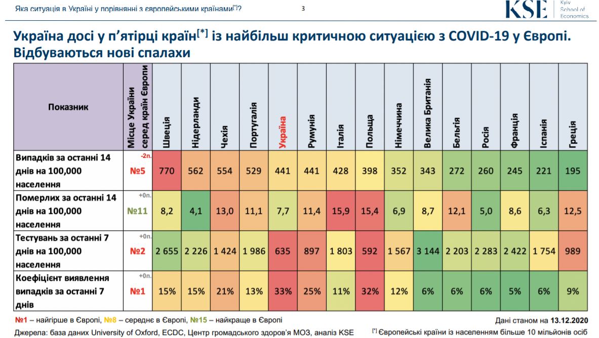 Найгірший показник смертності за останні 14 днів на 100 тисяч населення зафіксовано в Чернігівській області - 12,4. Також критична ситуація спостерігається в Харківській (11,1), Донецькій (11), Херсонській і Полтавській (по 9,8) областях.