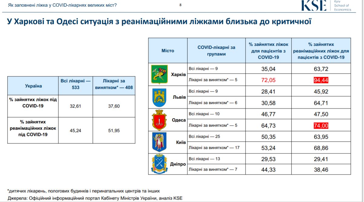 За даними KSE, фактична завантаженість реанімаційних ліжок в ковідних лікарнях Харкова становить 94%, в той час, як офіційна - 55,85%, у Львові - 64,7% (офіційна - 51,74%), в Одесі - 74 % (офіційна - 39,5%).