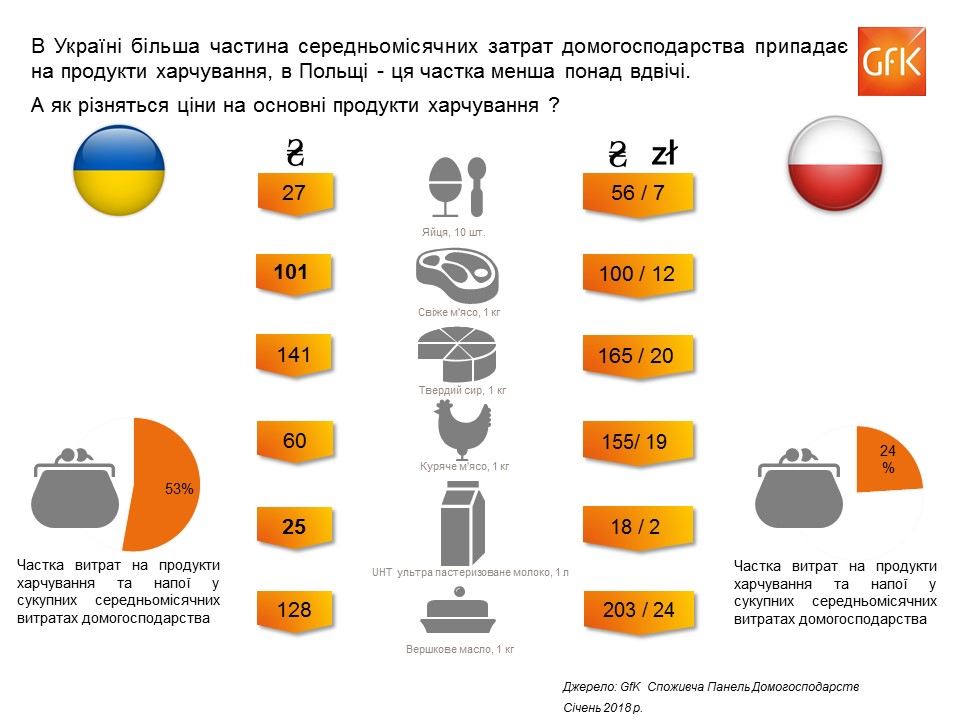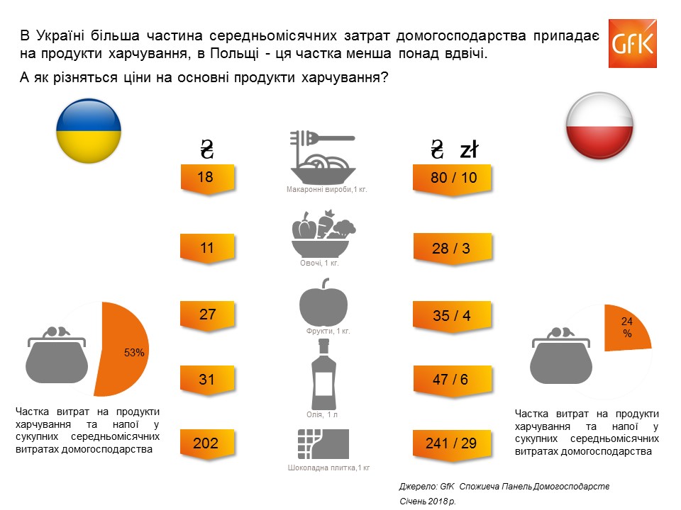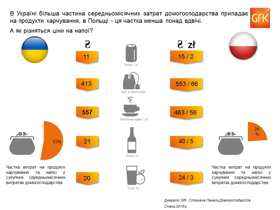 Компанія GfK за допомогою даних споживчої панелі домогосподарств порівняла, скільки платить домогосподарство в Україні та в Польщі за повсякденні харчі та напої.