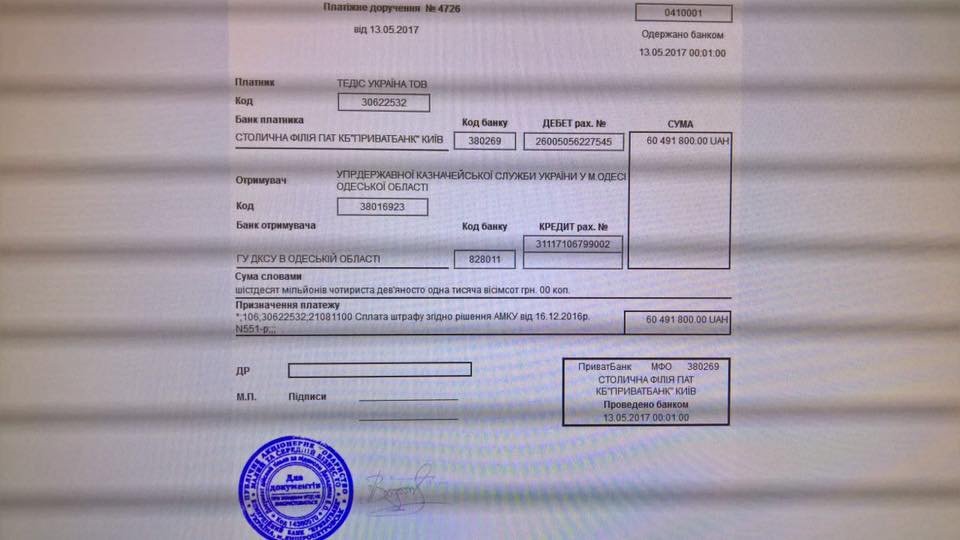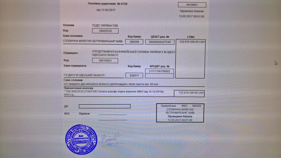 "Після завершення перевірки Держфінмоніторингу другий транш 300-мільйонного штрафу, накладеного на ТОВ "Тедіс-Україна", зараховано до держбюджету. Перший транш у сумі 106 505 700 грн. був перерахований відразу – 26 квітня 2017 року.", – зазначила вона.