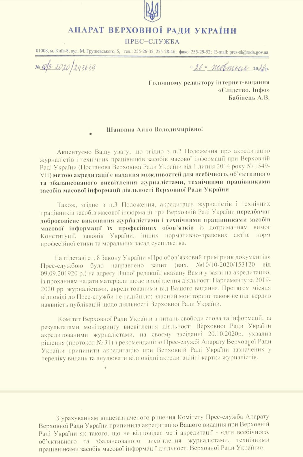 «Ми отримали листа від прес-служби про те, що всіх журналістів нашої агенції позбавлено акредитації, оскільки ми не всебічно висвітлюємо роботу Верховної Ради», - пише у Facebook головред «Слідства.Інфо» Ганна Бабінець.
