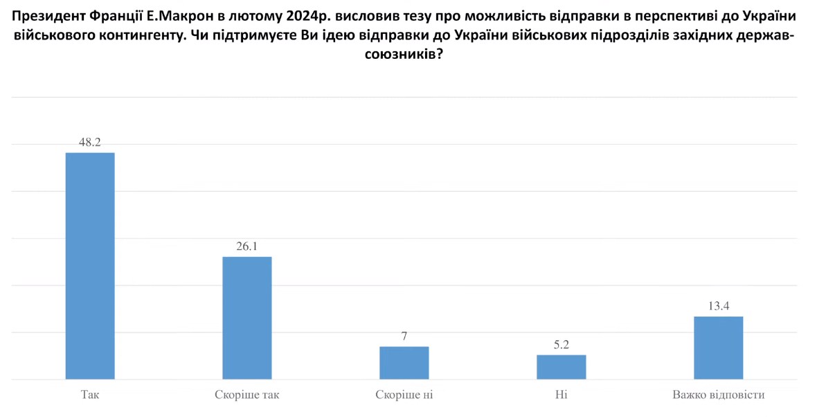 Майже більшість – 48,2% респондентів – підтримує введення в Україну військового контингенту західних держав-союзників. Скоріше підтримує таку ідею, оприлюднену нещодавно президентом Франції Еммануелем Макроном, 26,1% опитаних. 74,3%, тобто дві третини опитаних за чи скоріше за залучення іноземних союзницьких військ для захисту України від агресора. Такі результати соціологічного дослідження оприлюднені експертами Центру Разумкова щодо соціологічного дослідження відношення українців до найважливіших зовнішньополітичних питань.