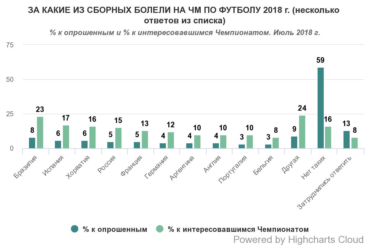 Серед 32 збірних, представлених на турнірі, найчастіше жителі України вболівали за Бразилію (8% всіх опитаних і 23% цікавилися чемпіонатом); Іспанії (6% всіх опитаних і 17% цікавилися чемпіонатом); Хорватії (6% всіх опитаних і 16% цікавилися чемпіонатом); Росію (5% всіх опитаних і 15% цікавилися чемпіонатом) і Францію (5% всіх опитаних і 13% цікавилися чемпіонатом). У той же час майже дві третини всіх опитаних (59%) і 16% цікавилися чемпіонатом не вболівали за одну зі збірних.