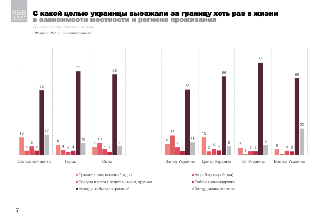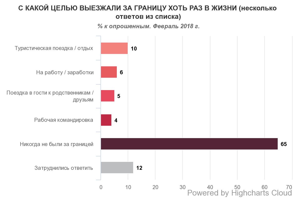 Основними цілями виїзду українців за кордон є туристичні поїздки чи відпочинок (10%), робота чи заробітки (6%), поїздки до родичів (5%) і робочі відрядження (4%).