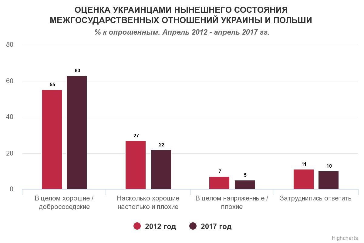 На думку 46% українців, у 2015-2017 рр.. відносини двох країн покращилися, ще третина (30%) вважають, що характер українсько-польських відносин в останні два роки не зазнав змін. Лише кожен десятий (11%) зазначає погіршення відносин двох країн.