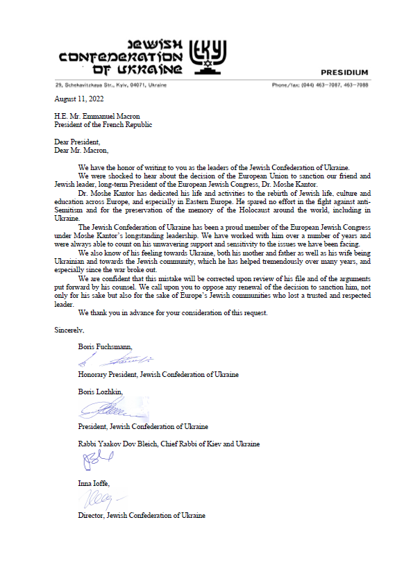 Окремі представники єврейської спільноти в Україні у тому числі ексглава Адміністрації п’ятого президента України Петра Порошенка Борис Ложкін склали та підписали листа адресованого до президента Франції Емануєля Макрона з проханням зняти санкцій з близького до президента РФ Владіміра Путіна олігарха Моше Кантора. Про це повідомив головний експерт StateWatch Олександр Лємєнов.