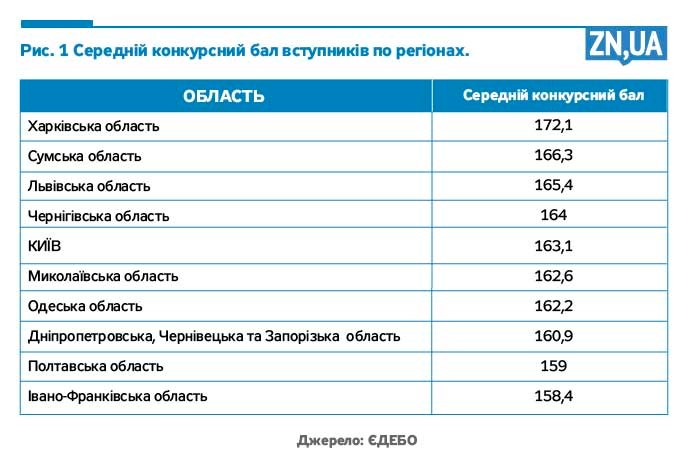 Дані ЄДЕБО дають змогу порівняти навіть середній бал вступників по кожній області. Звісно, це середня температура по палаті, де провали в малопрестижному виші компенсуються злетами у потужному, а сильна кафедра чи факультет витягує показники всього вишу. Але загальний бал свідчить про наявність потужних струменів в освіті: чи є вони і наскільки сильні.