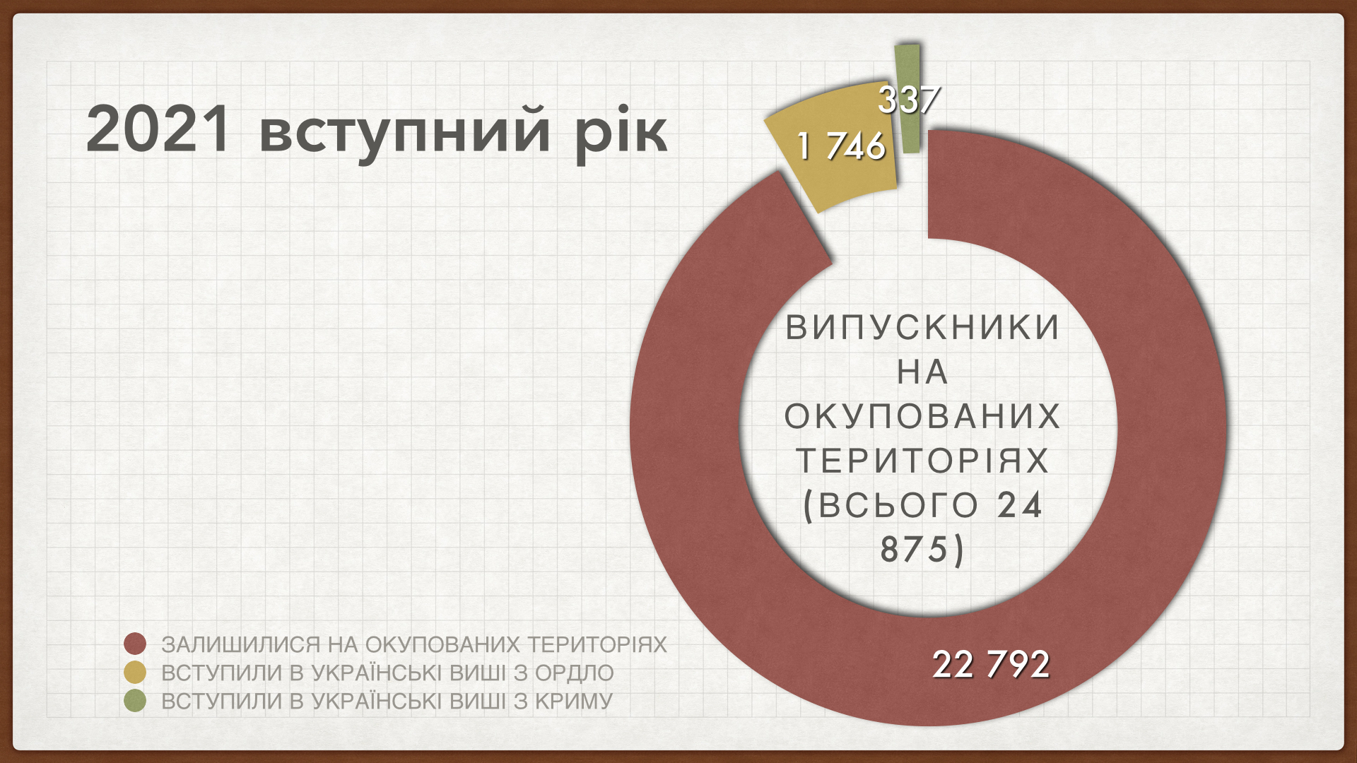 Цього року студентами українських вишів стали 2 083 мешканці тимчасово окупованих Криму та Донбасу; з них 1 746 – жителі Донецької і Луганської областей, 337 – Криму. Вчитися на підконтрольну Україні територію виїхали лише близько 8% юнаків та дівчат, пише журналістка Наталія Адамович у статті «Втрачені агенти змін: чи справді Україна робить усе для залучення абітурієнтів із ТОТ? »