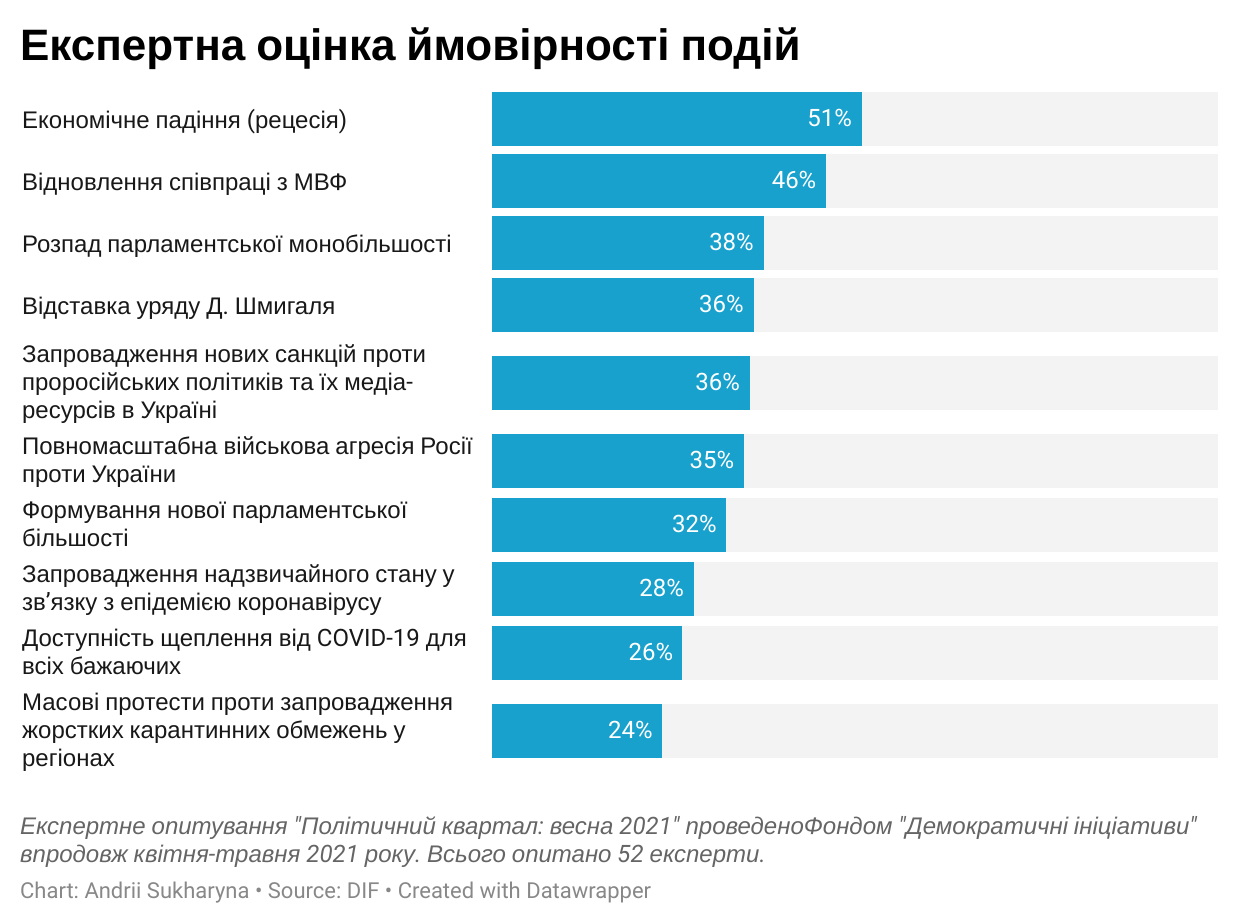 Також відносно ймовірним (46%) експерти вважають відновлення співпраці з Міжнародним валютним фондом. Можливість розладу в парламентській монобільшості найближчим часом експерти оцінюють у 38%.