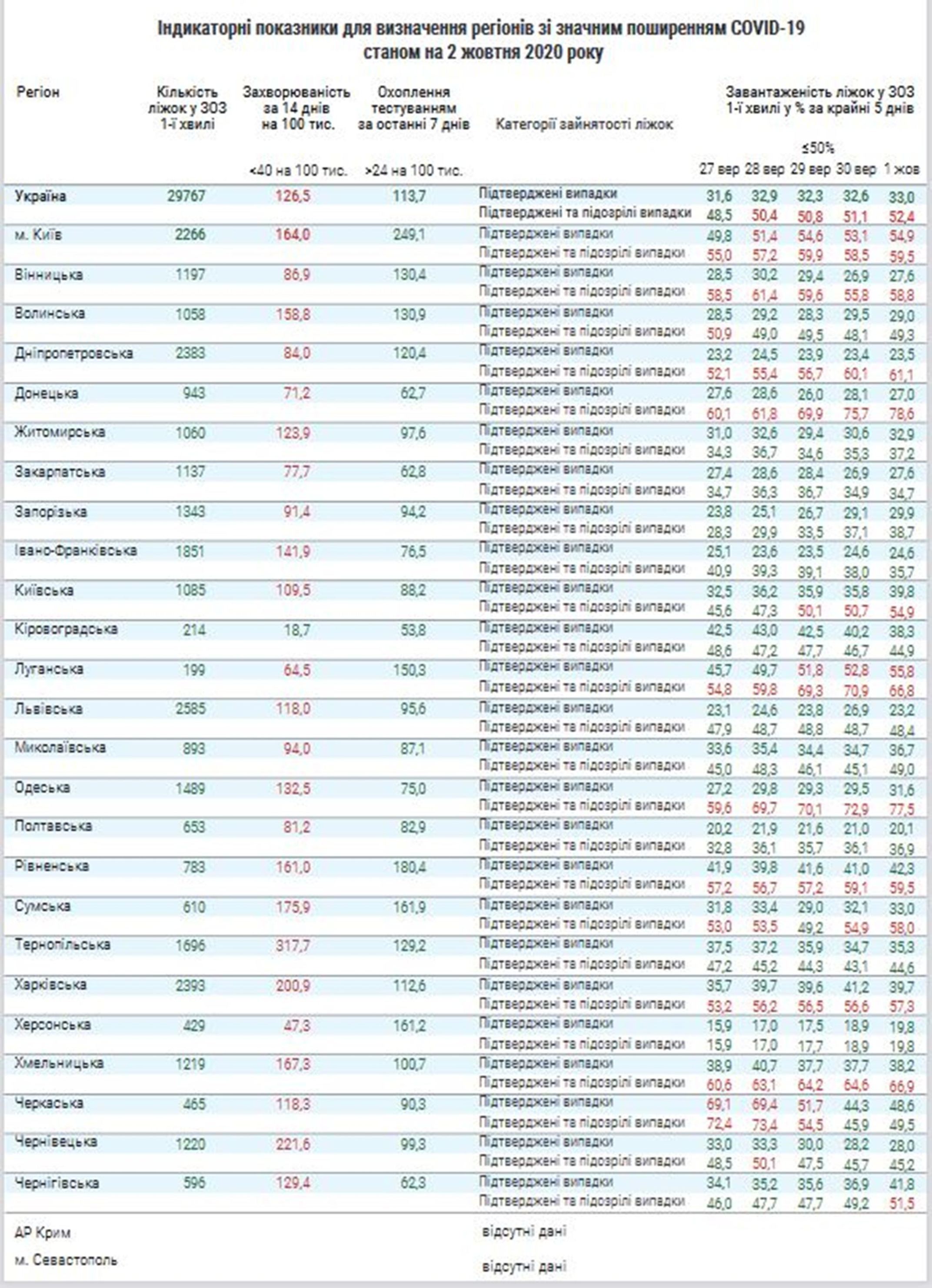 У Києві захворюваність COVID-19 за 14 днів склала 164 на 100 тисяч осіб, завантаженість ліжок в лікарня першої хвилі станом на 1 жовтня в столиці становить 59,5% за останні 5 днів.