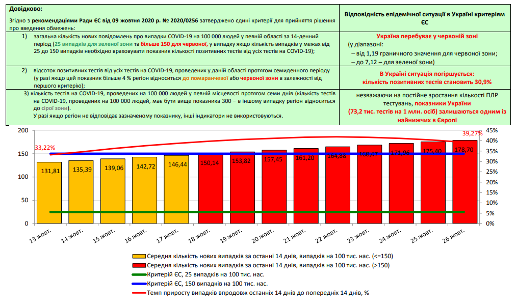 Зазначається, що загальна кількість нових повідомлень про випадки COVID-19 на 100 тисяч людей у певній області за 14-денний період має становити 25 випадків для "зеленої зони" та більше 150 для "червоної". Наразі Україна перебуває в "червоній зоні".
