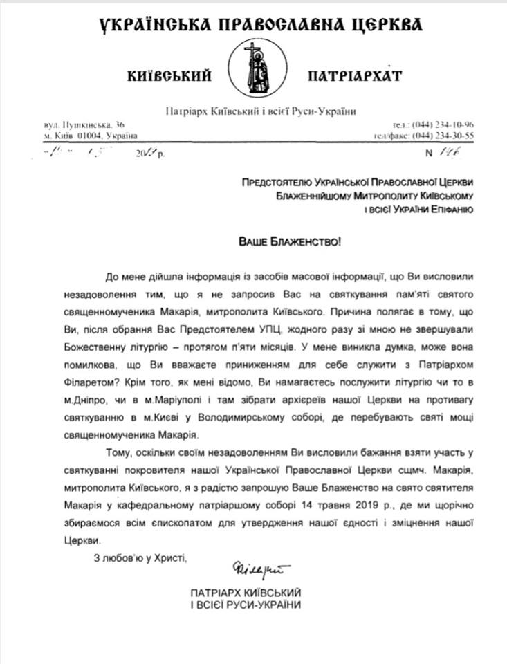 "Тому, оскільки своїм незадоволенням Ви висловили бажання взяти участь у святкуванні покровителя нашої Української Православної Церкви сщмч. Макарія, митрополита Київського, я з радістю запрошую Ваше Блаженство на свято святителя Макарія у кафедральному патріаршому соборі 14 травня 2019 р., де ми щорічно збираємося всім єпископатом для утвердження нашої єдності і зміцнення нашої Церкви", - додав Філарет.