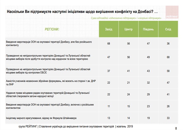 Ідеї введення в Донбас миротворчої місії ООН без участі в ній громадян РФ – у центральних і західних. Введення миротворців ООН з російським контингентом не має переважної підтримки в жодному з макрорегіонів.