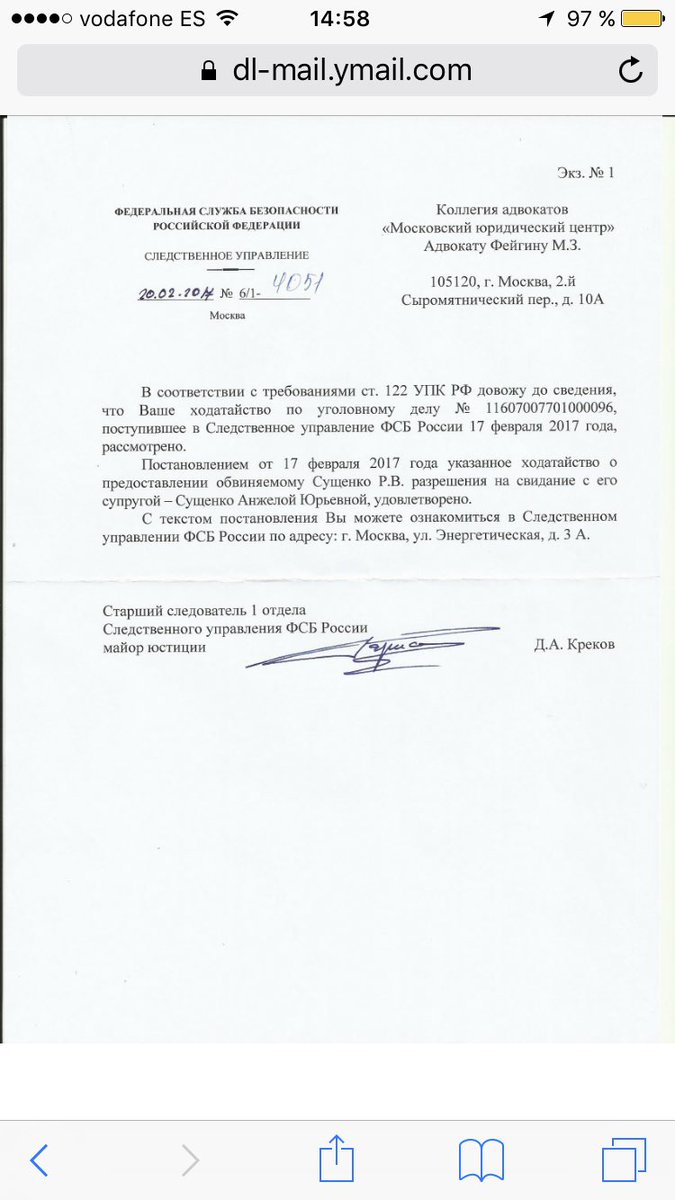 В російському ФСБ запит Фейгіна на побачення Романа Сущенко з дружиною задовольнили 17 лютого 2017 року.