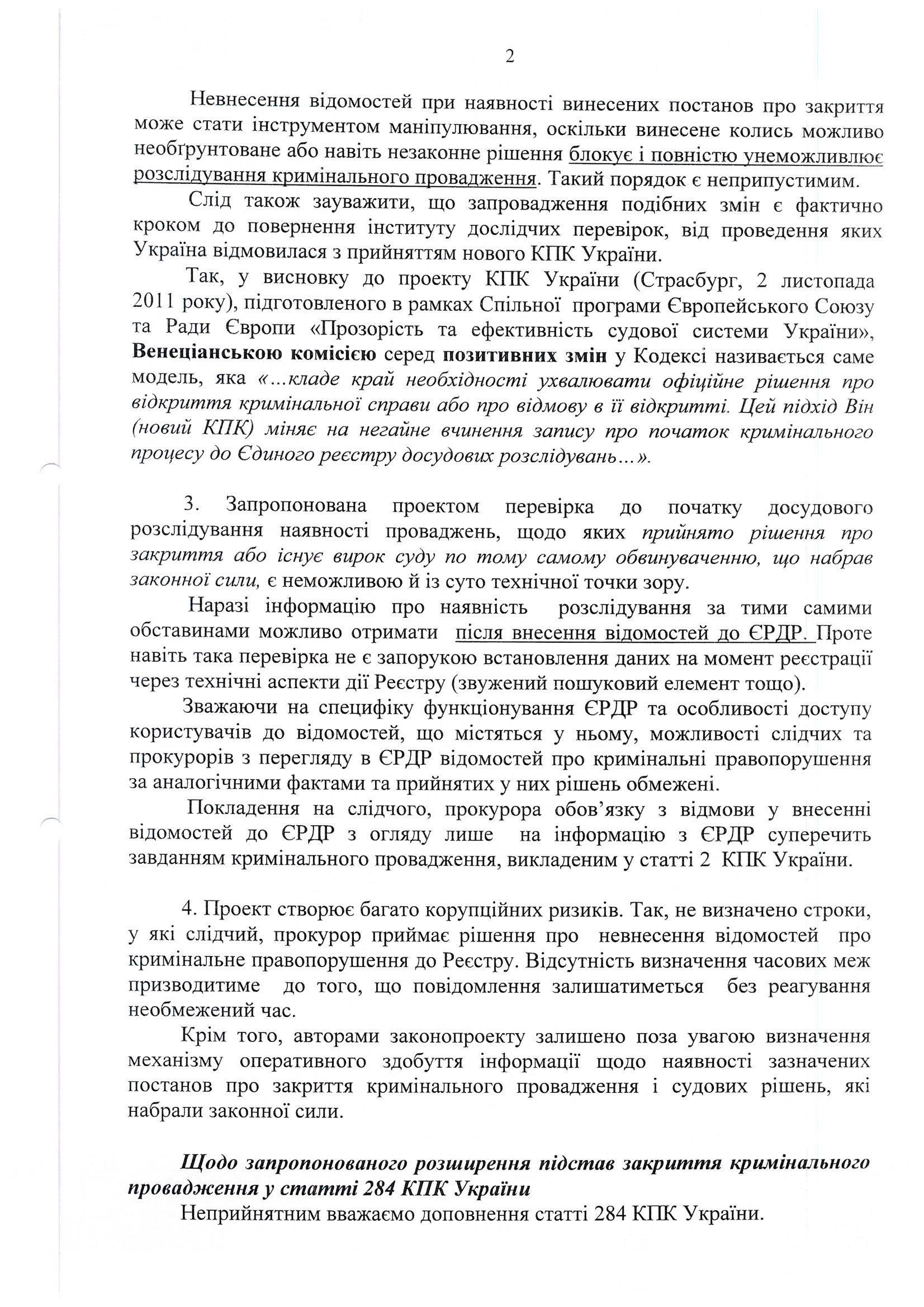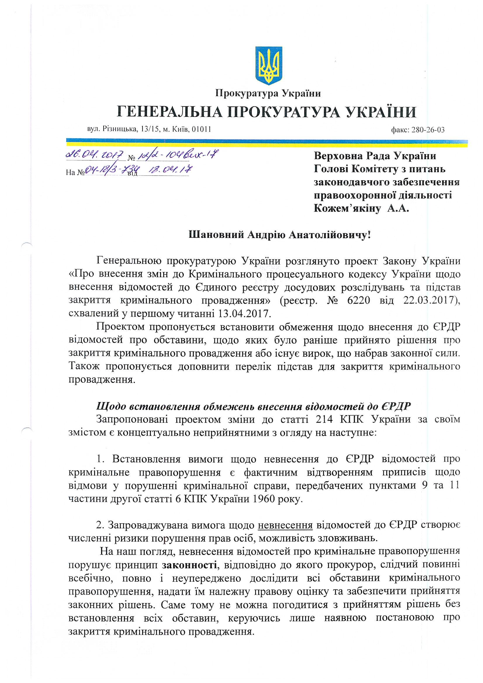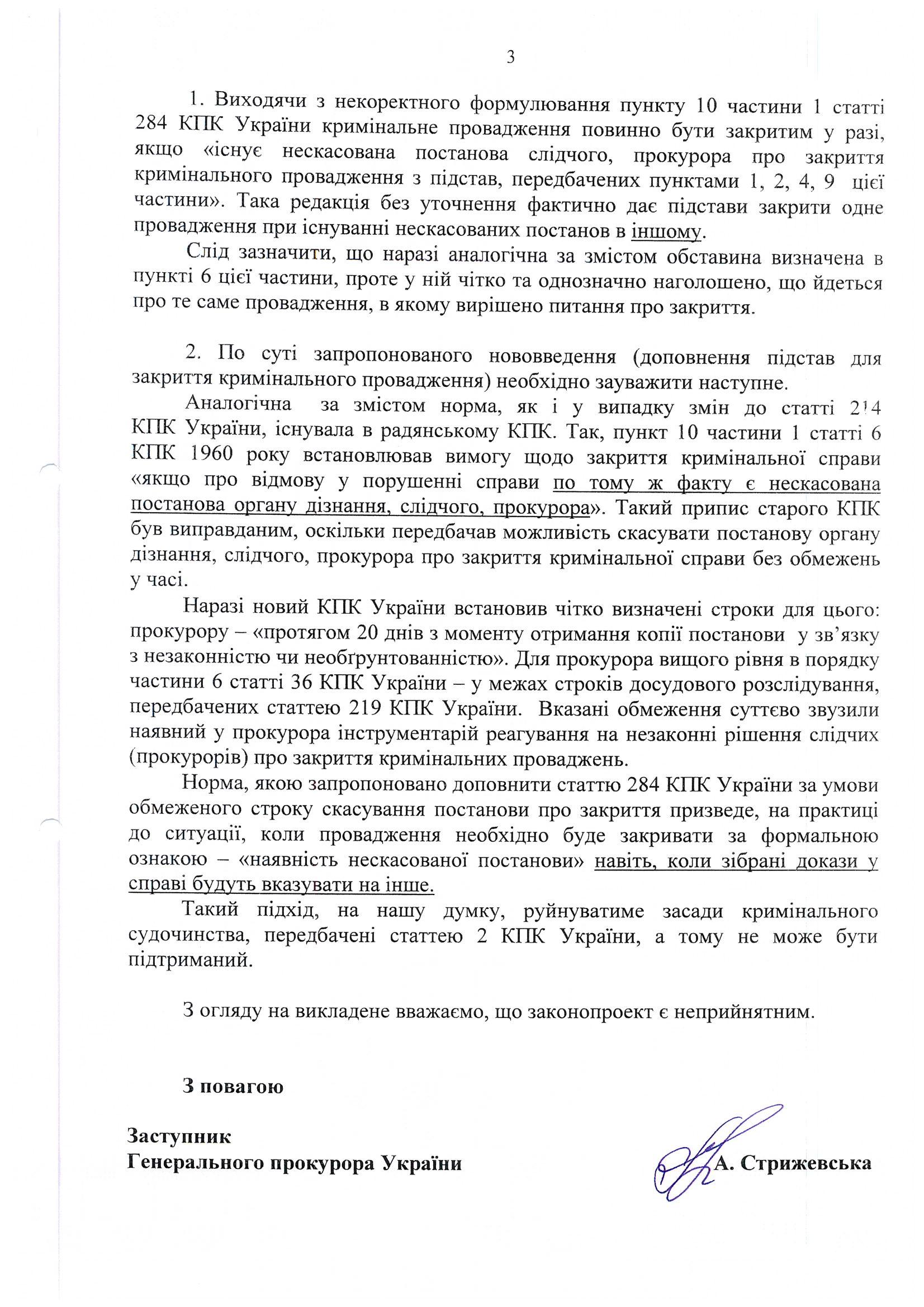 "заступник Генерального прокурора України А. Стрижевська звернулася з листом до Голови Комітету з питань законодавчого забезпечення правоохоронної діяльності А. Кожем'якіна, у якому виклала аргументи, чому запропоновані проектом обмеження щодо внесення відомостей до ЄРДР, а також розширення підстав закриття кримінального провадження у статті 284 КПК України є концептуально неприйнятними", – йдеться в повідомленні.