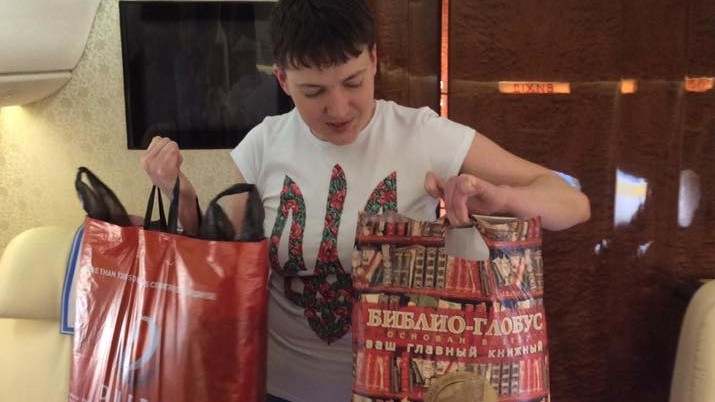 Першими словами Надії на борту президентського літака були "Слава Україні!". З місць ув'язнення Савченко взяла з собою вироби з паперу, зроблені нею в камері, а також пакети з отриманими листами.