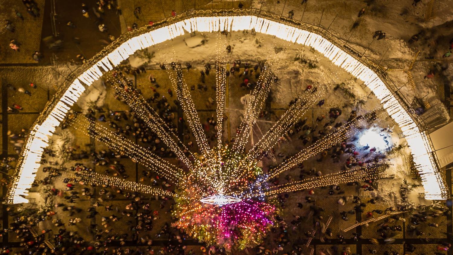 У Києві на Софійській площі 19 грудня запалили головну ялинку України. Як це відбувалося з висоти пташиного польоту показало видання "Апостроф".