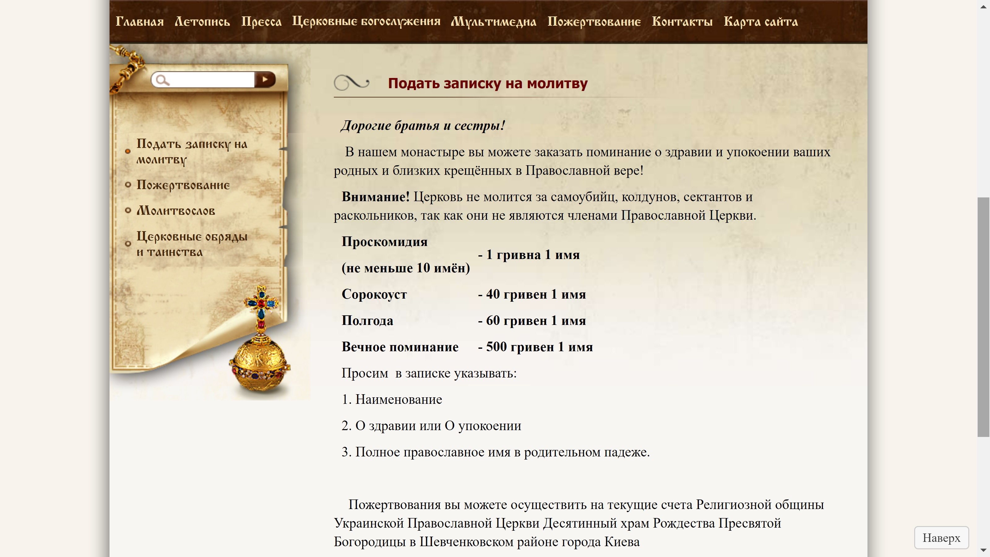 Десятинний монастир навіть на своєму сайті виклав офіційний прайс за згадування прихожан у молитвах. Так, наприклад, довічне згадування тут коштує 500 гривень. Проплату можна робити як готівкою, так і безготівковим способом. Окремо тут приймають також і пожертви.