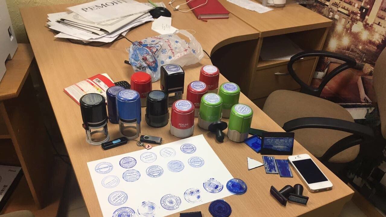 Також під час обшуків за місцем проживання співучасників злочинної групи та офісних приміщень було вилучено бухгалтерські документи та чорнові записи, що підтверджують протиправну діяльність, підроблені печатки органів державної влади та печатки підприємств з ознаками фіктивності, нерезидентів, штампи і печатки нотаріусів.