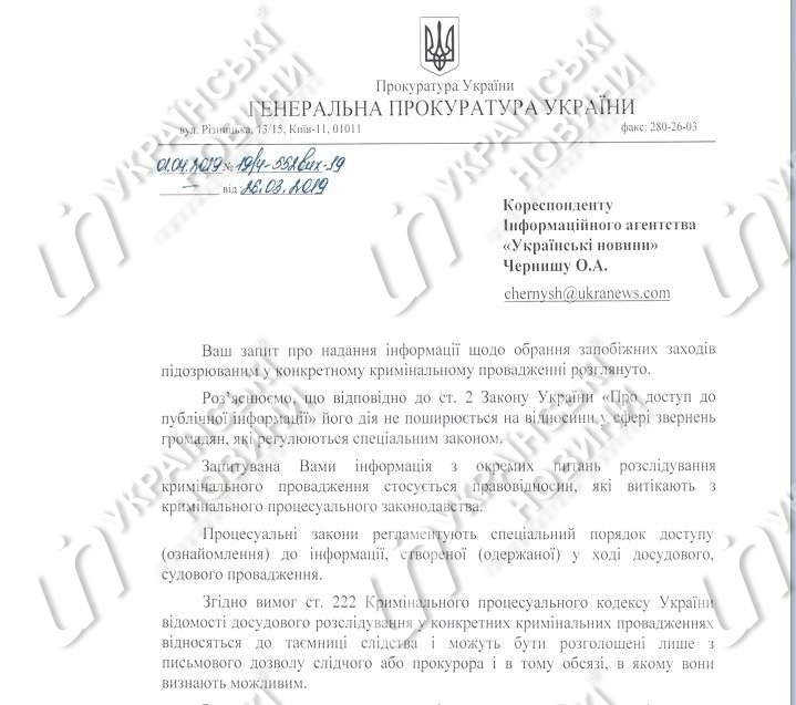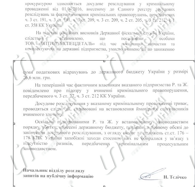 "Оскільки підозрюваними Р. і Ж. у встановленому законом порядку збитки, завдані державному бюджету, погашені в повному обсязі, до кінця досудового розслідування... запобіжні заходи щодо них не обиралися у зв'язку з відсутністю ризиків, передбачених кримінальним процесуальним законодавством", - йдеться у відповіді Генпрокуратури на журналістський запит.