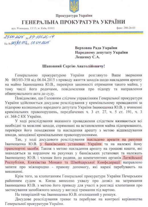 Лещенко у своєму блозі раніше писав, що в ГПУ допомогли зняти арешт з рахунків Іванющенко. Депутат зазначив тоді, що зняття арешту з рахунків соратника Віктора Януковича Юрія Іванющенка в Євросоюзі посприяло лист ГПУ, в якому зазначено, що він до кримінальної відповідальності в Україні не притягувався, в розшук не оголошувався і не є стороною кримінально виробництва.
