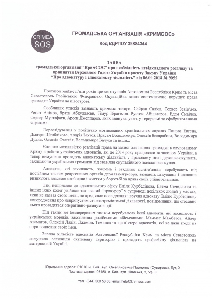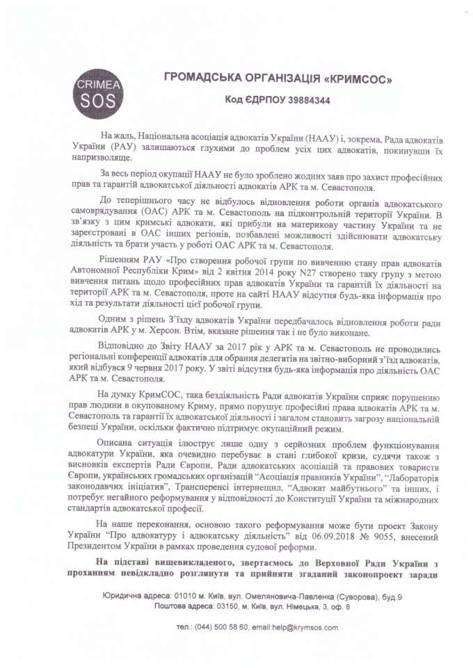 Українські адвокати, які виїхали на материкову частину України після анексії Кримського півострова та не зареєструвалися в інших регіонах, досі не можуть здійснювати адвокатську діяльність та брати участь у роботі органів адвокатського самоврядування (ОАС) Криму та міста Севастополя. Про це йдеться в заяві громадської організації "Крим СОС" щодо необхідності невідкладного розгляду та прийняття Верховною Радою законопроекту України "Про адвокатуру і адвокатську діяльність".