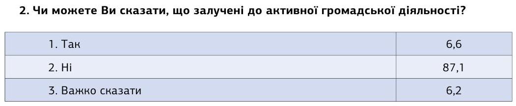 При цьому трохи активнішою вважає себе молодь – понад 10% опитаних вказують, що залучені до громадської активності.