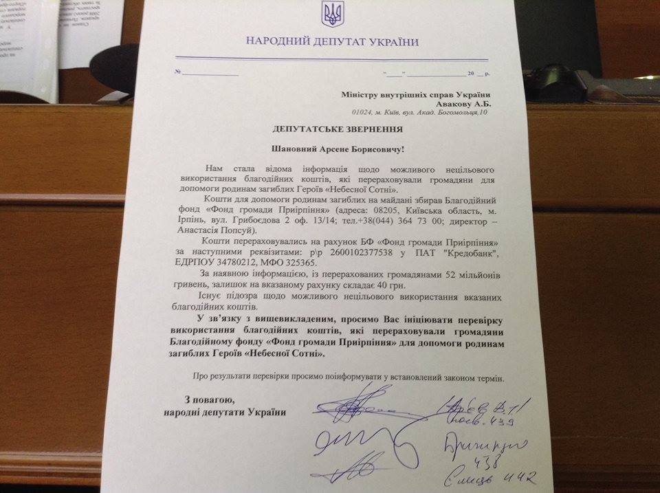 29 травня на фейсбук-сторінці народного депутата України Олександра Бригинця було опубліковано фото депутатського запиту від імені депутатів Олександра Бригинця, Володимира Ар'єва та Олександра Ємця на ім'я міністра МВС Арсена Авакова з вимогою розслідувати пропажу з рахунків Фонду громади Приірпіння грошей, зібраних для сімей героїв Небесної Сотні.