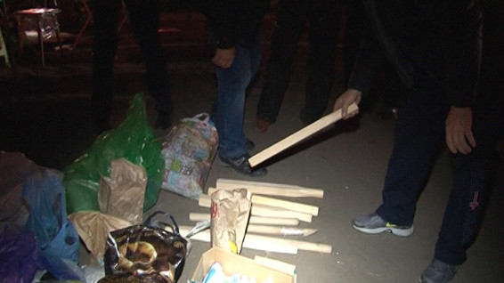 "Активісти на площі незаконно встановили намети, зробили огорожу з дерев'яних піддонів і піску, запалили багаття і все це вони робили з певною метою. Про це явно свідчать вилучені у них небезпечні предмети, а саме: ящик з "коктейлями Молотова", маски, дерев'яні палиці, вибухові пакети та гвоздик", - йдеться в повідомленні харківських правоохоронців.