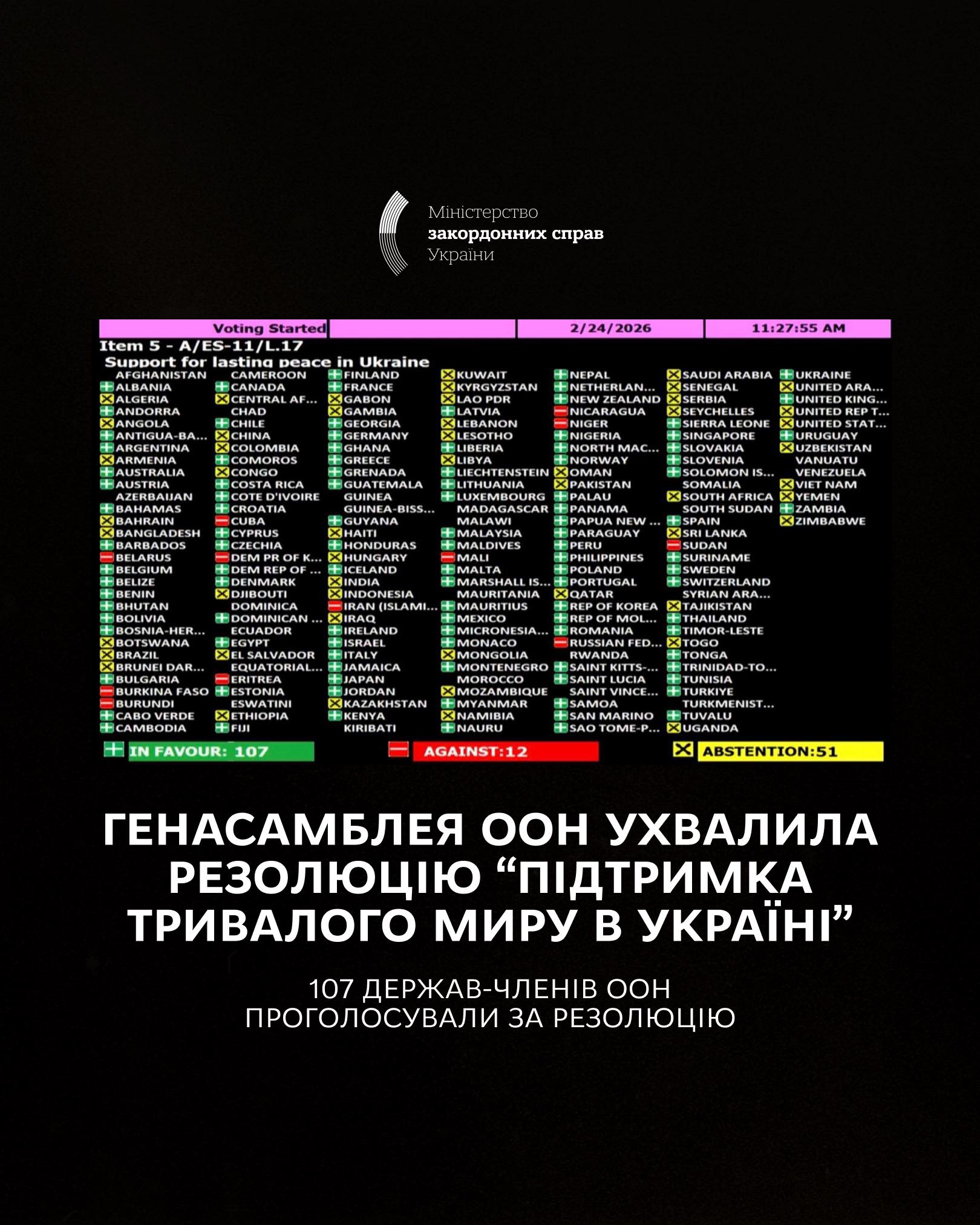“Я вітаю сьогоднішнє ухвалення резолюції Генеральної Асамблеї ООН "Підтримка тривалого миру в Україні"... Для нас це не просто чергове голосування. Це підтвердження того, що Україна не є сам на сам – і що принципи Статуту ООН і надалі мають значення”, – заявив міністр закордонних справ Андрій Сибіга.